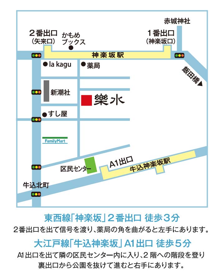 東京メトロ東西線「神楽坂」2番出口徒歩3分 大江戸線「牛込神楽坂」A1出口から徒歩5分